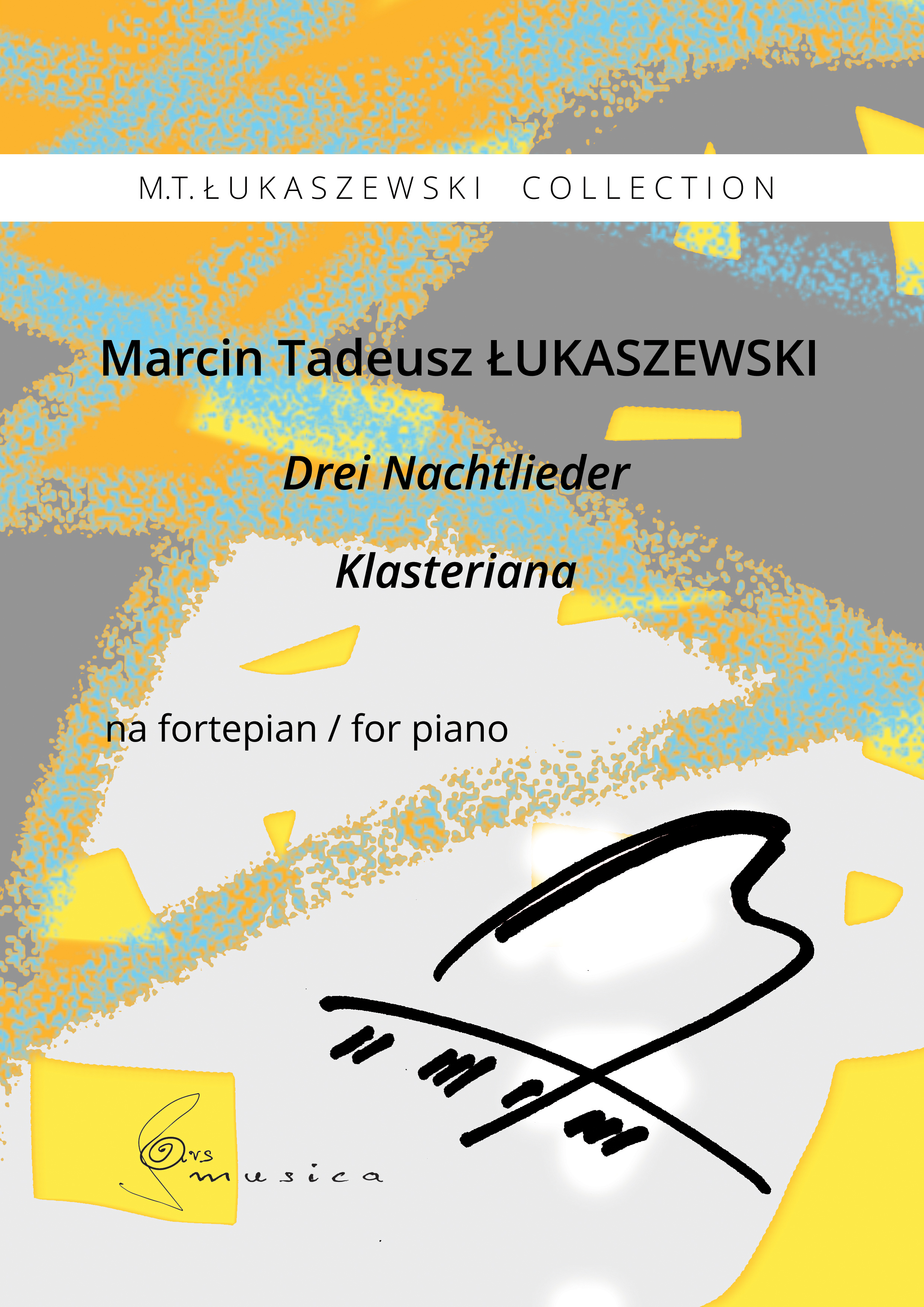 Marcin Tadeusz ŁukaszewskiDrei Nachtlieder, Klasteriana na fortepian „Drei Nachtlieder”, wbrew tytułowi, są utworem jednoczęściowym. Pisząc go zamierzałem nawiązać do tradycji nokturnu, gatunku utożsamianego głównie z muzyką romantyczną. W „Klasterianie”, jednoczęściowym utworze, pragnąłem wyzyskać sonorystyczne możliwości fortepianu, wynikające z użycia wyłącznie różnego rodzaju klasterów. [M.T.Łukaszewski] ISMN 979-0-9020126-6-9cena: 30 PLN